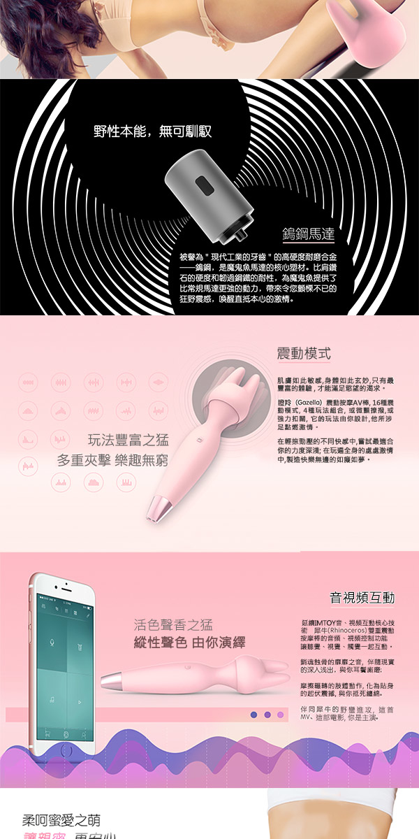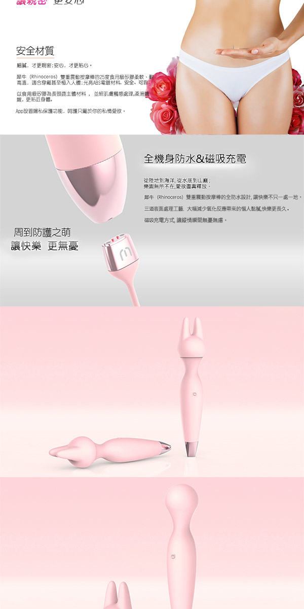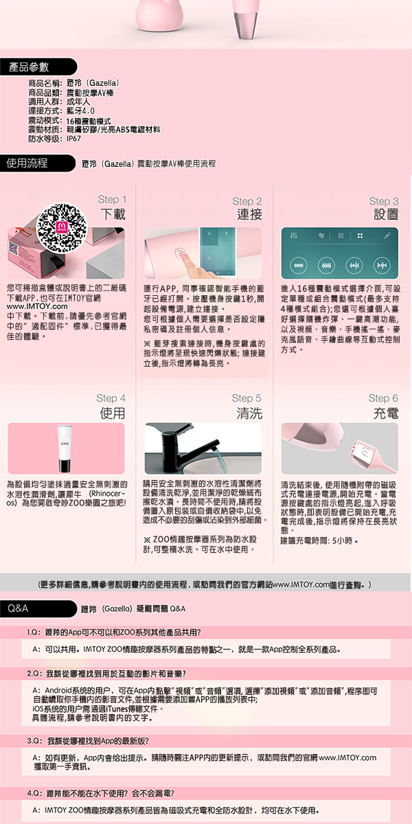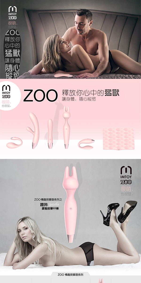 IMTOY全新動物園女性按摩棒系列,以平民的價格,享受高端的質量! 瞪羚是一款能全身按摩的震動棒,強大的震動力能消除身上一切疲勞,設有一個兔耳頭的替換頭,能按自己喜好重點按摩你喜好的部為,例如夾緊乳頭和陰蒂位置。表面以25度食用級矽膠製成,非常順滑,亦親人體肌膚,女仕可以安心使用。整體以迷人的粉色為主調,再加上尾部電鍍位置,樣子非常討好,對初入門的女仕能大大提高接受程度。超強的震動力,全防水,靜音設計,磁力充電和一年保養,全部高端品牌才有的功能集於一身,加上智控功能,可與APPS連動作出無限變化的震動頻率,絕對能成為妳心愛的收藏品之一!