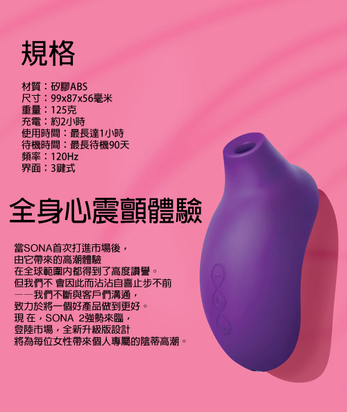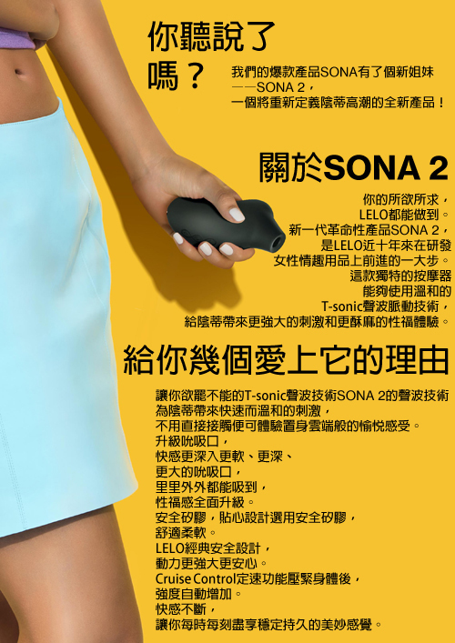 我們的爆款產品SONA有了個新姐妹—SONA 2,一個將重新定義陰蒂高潮的全新產品!關於SONA 2你的所欲所求,LELO都能做到。新一代革命性產品SONA 2是LELO近十年來在研發女性情趣用品上前進的一大步。這款獨特的按摩器能夠使用溫和的T-sonic聲波脈動技術,給陰蒂帶來更強大的刺激和更酥麻的性福體驗。讓你欲罷不能的T-sonic聲波技術SONA2的聲波技術為陰蒂帶來快速而溫和的刺激,不用直接接觸便可體驗置身雲端般的愉悅感受。