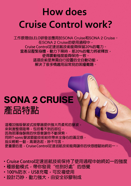 • SONA 2 Cruise 額外配有 Lelo 獨家研發 Cruise Control 功能。正常情況下 Cruise Control 會保留 SONA Cruise 20% 的動力,當你用力按壓身體時,馬達開始降低動力,預存的 20% 的動力釋放,增加的動力可以足以維持按摩的強度,換以言之,SONA 2 Cruise 比起 SONA 2 的力度會更加強力及穩定。初入門者可選擇 SONA 2;對於力度有更多追求、希望擁有更多刺激感的話可選擇 SONA 2 Cruise