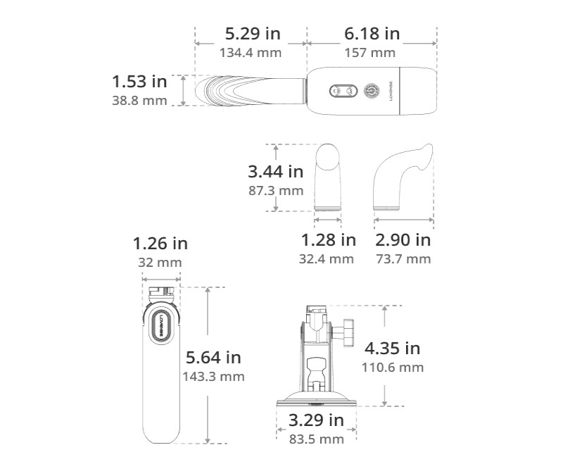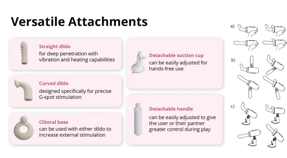• 多款配件 — 包括直身按摩棒(具震動+加熱功能)、弧形G點棒以精準刺激G點,以及陰蒂底座,可配合任一棒體使用。
