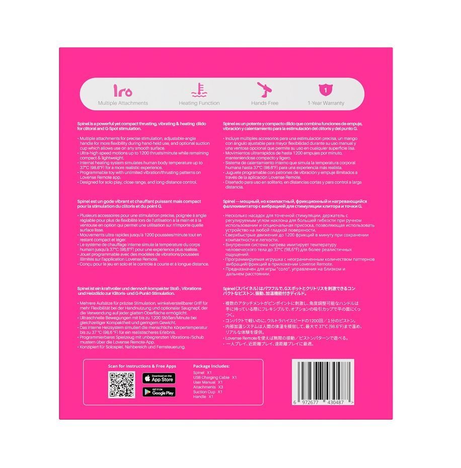 專為提供針對性內外雙重刺激而設計,Lovense Spinel 可APP控推撞抽插加熱式按摩棒(手持/吸啜底盤) 為一款可插入式手持裝置,結合推撞、震動及加熱感受。其直身及弧形配件能精準針對G點,或提供深層插入感,同時底部專屬陰蒂座能加強外部刺激。Spinel 設計靈活貼心:可調節推撞角度及多樣震動模式,營造流暢沉浸的快感;輕巧便攜的外型則方便隱密收藏及外出使用。