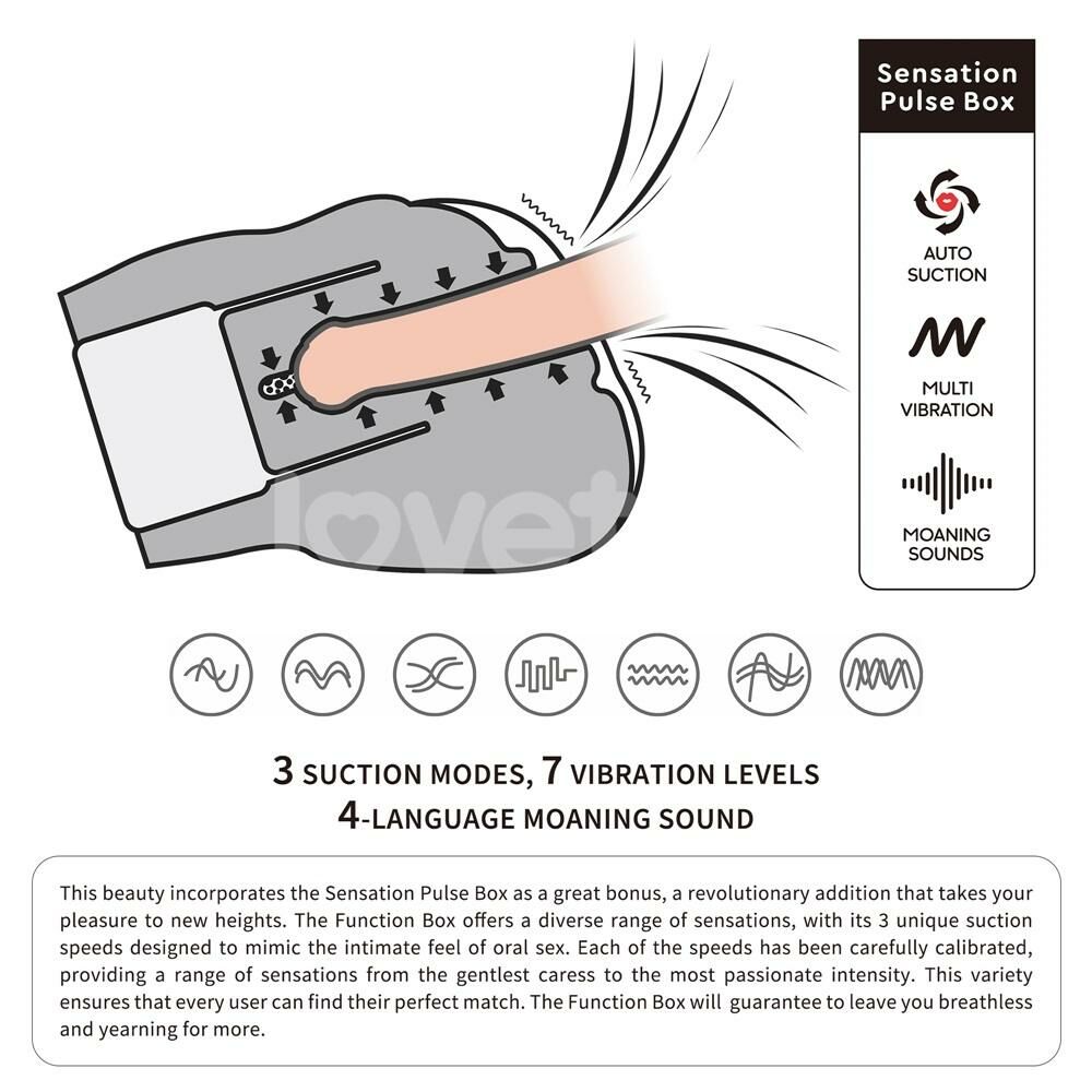 它還集成了Sensation Pulse Box這一革命性的加持,將您的歡愉推向新高度。功能盒提供多種感官體驗,3種獨特的吸吮速度模擬口交的親密感受。每種速度都經過精心調校,從最柔和的撫摸到最激情澎湃的刺激,應有盡有,確保每個使用者都能找到最適合自己的體驗。這功能盒定能讓您喘不過氣,渴望更多。
