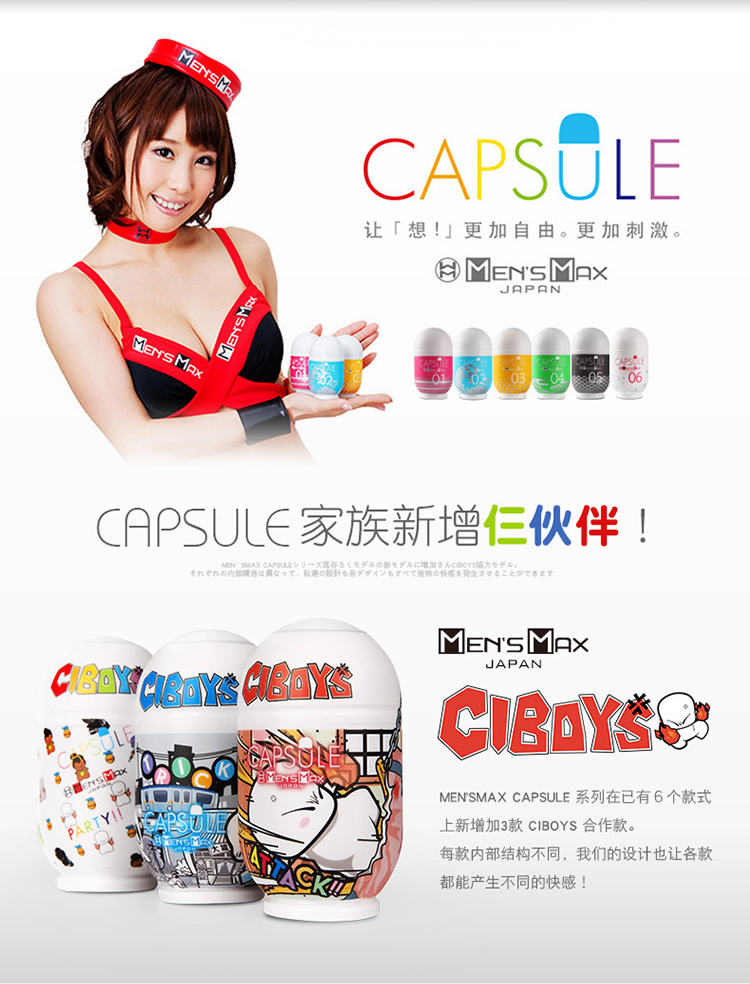 MEN'S MAX - CIBOYS X Men's Max 自慰蛋系列, CIBOYS 大家也不會默生,現正聯同日本大廠Men's Max 共同推出全新的Capsule 自慰蛋系例!! 三款抵死有趣的CIBOYS包裝,內藏一款非常高質,耐用的自慰器。三款內紋各有不同特色,大家可因應自己喜愛的包裝來選購,無論送禮自用亦非常適合。