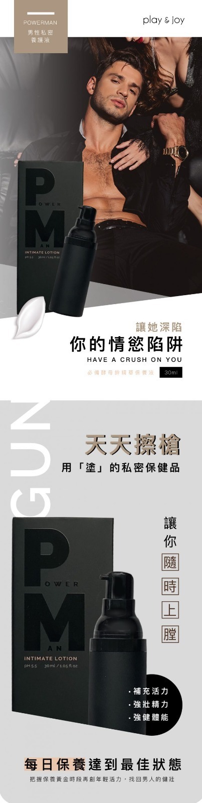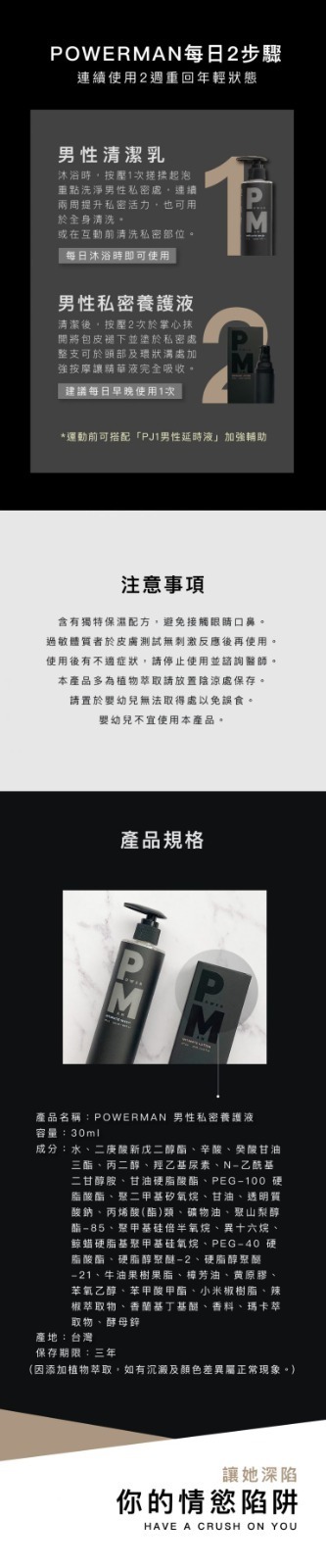 POWERMAN男性私密養護液採用保水玻尿酸為基底製成,添加天然瑪卡及草本抑菌配方,使用時會有微熱發脹感。每日使用能有效淡化私密處肌膚細紋,維持肌膚光滑細緻,透亮並改善暗沉,持續使用可確保私密部位的青春強壯。