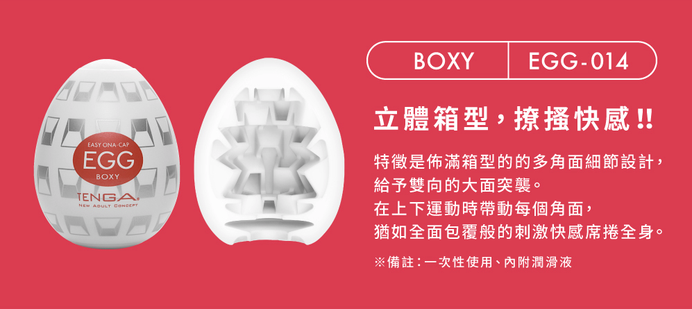 立體箱型,撩搔快感!Tenga Egg - 方盒的特徵是佈滿箱型的的多角面細節設計,給予雙向的大面突襲。在上下運動時帶動每個角面,猶如全面包覆般的刺激快感席捲全身。
