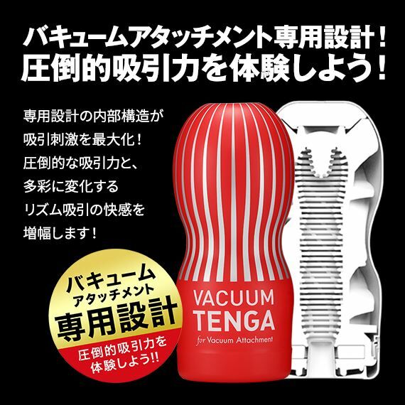 VACUUM TENGA 特別設計的瓣膜營造出杯內近乎真空的效果,帶出真實的吸啜感覺。再者,獨特的擠壓形狀有助達到不能比擬的壓迫感。這些優點結合激起情慾的啜食聲,使你感覺有如真的享受著「深入」吸啜的感覺。搭配另售的真空附件,享受前所未有的超強真空刺激和節奏變化帶來的深度快感。