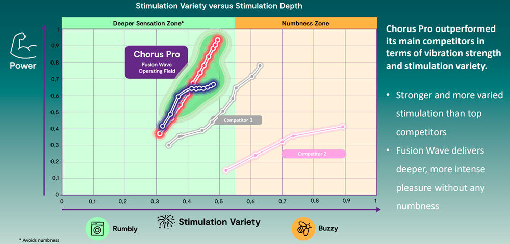 We-Vibe Chorus Pro 專為情侶設計,貼合於雙方之間,提供集中陰蒂刺激,同時能夠隨動作同觸感而靈敏回應。產品採用 Fusion Wave 科技,內置雙馬達,營造如波浪般的節奏震動,帶來更深層同多變嘅感覺,而唔會引致麻痺。配備可擠壓式 Haptic Squeeze 遙控器,用家能夠直覺式即時控制同獲得回饋,令雙方更能感受彼此調整。透過可調校鉸位、手機應用程式連接同免提觸感感應模式,Chorus Pro 為伴侶互動帶來觸覺同連繫嘅體驗。